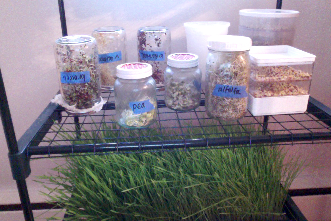Our new kitchen is a “living kitchen” …herbs growing in jars on the windows and an indoor garden shelf right in the kitchen stocked full of pots of more herbs, lettuce, wheatgrass and jars of every seed sprouting imaginable. Our latest venture? Chia seeds. Did you know you can eat Chia sprouts? They are the trickiest seed to sprout I’ve encountered, but so cool!